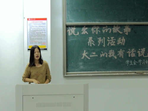 10月26日晚6:30,由学生会学习部举办的“说出你的故事”系列活动之大二的我有话说在文综楼1401、1501教室开展,本次活动的主讲嘉宾分别是13级的金韫之、张亚男、张雪彦、吉文丹四位同学。