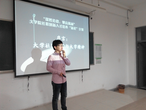 2014年10月29日晚,“探胜拾微,攀高揭秘”文学院社联创新人才培养计划“新星”计划的第一次培训在文综楼1003-3203开幕。拾微以探胜,揭秘而攀高,文院社联在创新性人才培养的目标上迈出沉稳的第一步。