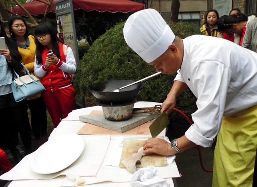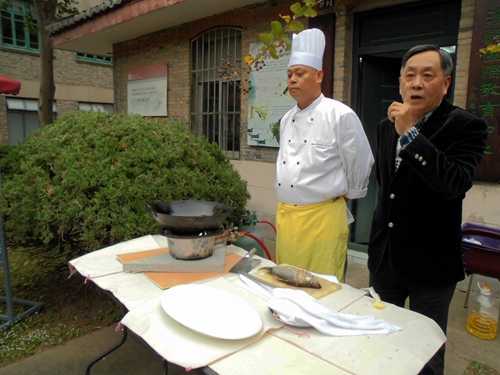 讲演结束后,大家前往第四教室前的草坪,欣赏苏帮菜大厨演示松鼠鳜鱼以及苏氏小排的做法。师傅刀工精湛,技术娴熟,同学们纷纷拿出手机拍摄。不久,菜入油锅,香味四散,大家迫不及待地领取碗筷,准备试吃。在争先恐后的试吃后,大家不禁连连赞叹苏帮菜的美味。