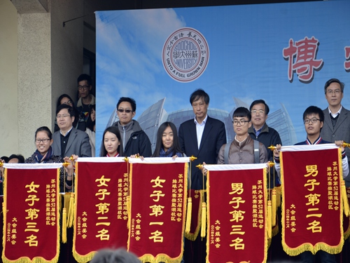 闭幕式第一项宣布了本次体育运动会的各项成绩。伴随着阵阵呐喊声和掌声,本届校运会组委会办公室主任王全法老师宣读了各校区的篮球比赛、排球比赛、拔河比赛男子组和女子组前三名;团体项目引体向上、仰卧起坐的前三名和田径比赛男女前六名的成绩。接着公布了此次运动会男女团体总分前三名,应用技术学院喜获第一名,商学院和文正学院分别获第二、第三名。最后由本届运动会组委会副主任、校学生工作处处长陈晓强老师宣布了获“优秀组织奖”的三个学院和获“体育道德风尚奖”的九个学院名单。其中,可喜的是文学院在排球比赛中成绩斐然,获排球比赛独墅湖校区女子第二名。在激昂的运动员进行曲中,各个学院代表依次入场,与会领导为个人和单位颁发了锦旗和奖杯。