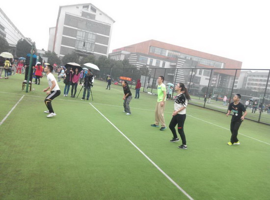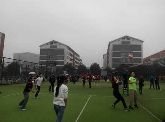 比赛还未开始,队员和啦啦队早已准备就绪。冰凉的秋雨和冷风并没有削减大家的热情,反而更激发了大家的斗志。比赛开始前十分钟,队员们在教练的指导下进行热身运动,队员们精神放松,跃跃欲试。接着,一声清脆急促哨声,比赛正式开始。法学院代表队势头强劲,发球有力,面对对方强有力的发球,我院几度扑空,连失五球,逐渐丧失赛场主动权,但队员们沉着应对、灵活改变策略,终于,一次稳稳当当的侧面垫球将发球权夺了回来,赛场出现转机,我院队员们渐入佳境,比分很快持平。赛场外,啦啦队的欢呼声一浪高过一浪,比赛更加激烈了,而这也更加增强了我院队员们的信心和激情。第一局我院虽以25:18的比分输于法学院,但第二局下来,我院以25:19的比分战胜法学院。于是,第三局加时赛在紧张人心的时刻拉开了帷幕。冰凉的雨滴越下越紧,赛场上的气氛越来越浓烈,比赛进入白炽化,敌我伯仲难分,裁判站在雨中,顾不得撑伞,全身心指挥队员。只见轻巧的球在赛场上空弹来弹去,有时猛烈,有时舒缓,有时出界,有时扣地,双方比分交替上升,裁判的每一笔记录都牵动着双方的心。最终,我院一分之差稍逊法学院,但谁能不为此刻的队员们鼓掌呢?他们给予了我们比输赢更为可贵的精神!