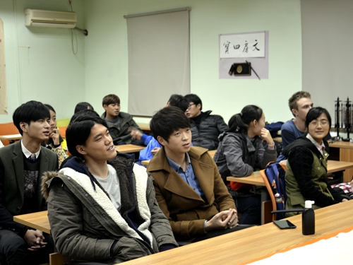 走进本部第四教室,热烈的交流在活动开始前已经展开了,在场的外国学生对中国文化都有着浓厚的兴趣。下午两点,活动准时开始,主持人安宝颖同学首先为大家播放了一段名为《礼仪之邦》的视频,视频中的演员全部着装汉服,大家都被具有独特汉民族风貌性格的服装深深吸引,为其杰出的工艺和美学啧啧称奇。