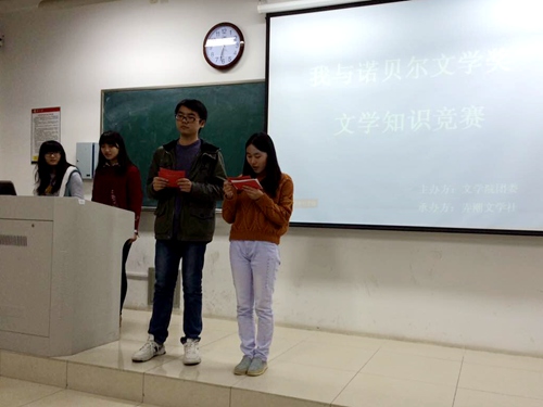 11月26日晚6:30,在文综楼的2201教室,弄潮文学社举办了“我与诺贝尔文学奖文学知识竞赛”12进6的初赛。主持人在简单地介绍了诺贝尔文学奖的历史后,介绍了出席本次活动的嘉宾:文学院团委秘书长鲍烨、文学院科协理事会理事长张怡、文学院社联主席王斌。