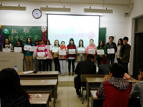 第三个是颁奖环节。首先是由王斌主席为各部门的进步之星颁奖,其次卢一凡副主席为各社团中的进步之星颁奖。这既是对干事努力工作的认可,又是对干事的一种莫大的鼓励。“进步之星”名额虽少,但在每一位部长的话语中都流露出同一个意思:每一个干事都很棒,进步都非常大!
