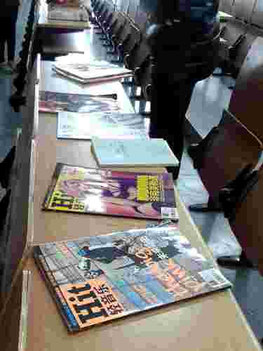 大约九点,工作人员陆续到达,他们拿出自己收集的书,小心翼翼的、仔细的将书籍分类摆好,分为“外院书籍”、“小说杂志”、“教材”、“考级考研”四类。之后他们就开始制作简单的海报,准备贴在墙上,吸引学生的目光。