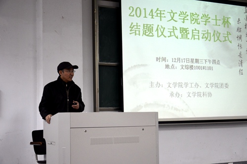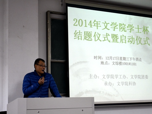 2014年文学院“学士杯”结题仪式暨启动仪式于12月17日下午4点在文综楼1101教室举行。本次活动由文学院团委、学工办主办,文学院科协承办。出席此次活动的领导老师有文学院副院长李勇、文学院副教授陈小民以及学工办主任兼12级辅导员纪金平。在主持人隆重的介绍及在场同学的热烈欢迎中,本次活动正式拉开了帷幕。