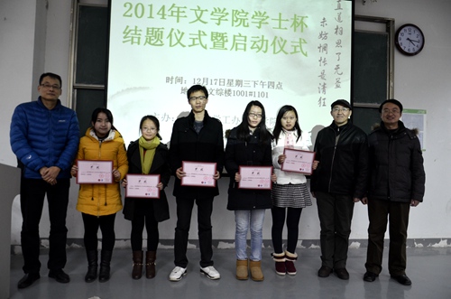 2013~2014年,许多同学在“学士杯”中取得了优异的成绩。在宣读获奖名单之前,李勇老师大致介绍了比赛的评选过程。依据同学们论文的不同类型,参赛作品将会被分配给相应领域的专业老师,由他们按照学术标准做出审评,其结果是公平公正的。在这一年度的比赛中,共有四十三位同学获奖。继而,李勇老师、陈小民老师及纪金平老师对闫思含、高家振等几位获奖学生代表颁发了奖状,以资鼓励。