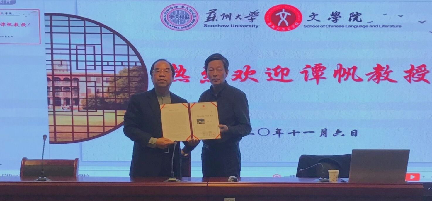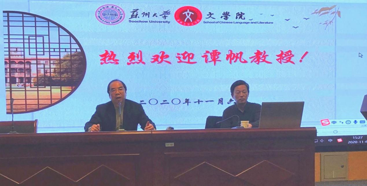 2020年11月6日下午15:00-17:00,苏州大学独墅湖校区1005#5339文学院学术报告厅内座无虚席。华东师范大学的终身教授谭帆应邀参加苏州大学文学院举办的“仲联学术讲坛”系列讲座活动,进行了题为《中国小说史研究之检讨》的学术报告。