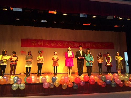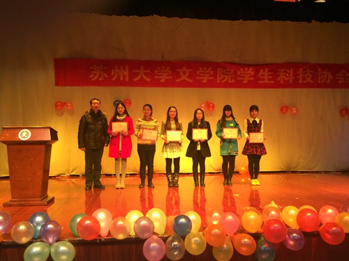 2014年12月29日晚六点半,文学院学生科技协会“但为君故,沉吟至今”主题年会在独墅湖校区二期五六食堂四楼大学生活动中心隆重开幕。本次年会到场的嘉宾有学工办主任、科协指导老师纪金平老师、11级科协理事长周立栋、副理事长倪雅群、钱佳甜,现任科协理事长张怡、科协副理事长尚卉、徐会娟、侯逸双和院内各组织负责人。除此之外,参加大会的还有科协11级、12级和13级部长以及科协14级新干事。