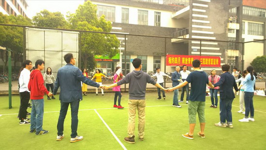 紧接着开始的是坐地起身游戏。这个游戏在第一环节分组的基础上,要求每组成员背靠背围成一个圈坐在地上,相互挽着相邻同学的胳膊,在不用手的情况下,每组同学相互支撑着同时站起来。有的组喊起口号,很快就获得了成功;有的组则因为大家默契不足,没有同时站起来而摔得东倒西歪。本环节比赛结束时,率先成功的小组获得了奖励,而第一次没有成功的小组在比赛结束后自行组织,通过共同努力和相互配合,终于成功完成任务。坐地起身游戏虽然看起来简单,但是需要团队成员相互照顾、弥补弱势,团队中的男生尤其要发挥自己的力量优势、带动全队的节奏,而女生们则是全队能否同时起身的关键。在经过了热身之后,同学们已经形成了相当的默契,男生们可以非常绅士地背起队伍中的女生,而女生们也展现出不凡的实力。