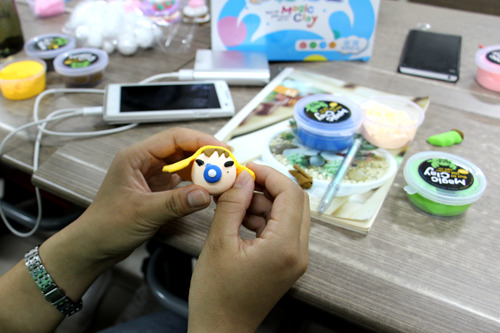活动开始,魏笑雪向同学们介绍了什么是超轻粘土和它干净清洁易保存等优点,接着,她展示了缤纷多彩的泥塑作品和粘土塑形的基本步骤。她认为超轻粘土的最大优势是便于制作小巧玲珑的卡通人物和可爱的小动物,而且轻泥塑不同于以往,它塑造的大多是较小的物件,用时也相对少,这对生活在快节奏时代的人们来说不失为一种轻松实用的减压方式。五颜六色的粘土带来了丰富多彩的艺术效果,而对指尖灵活的掌控要求则加强了泥塑的生动性。
