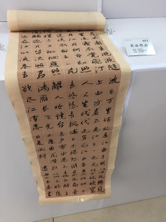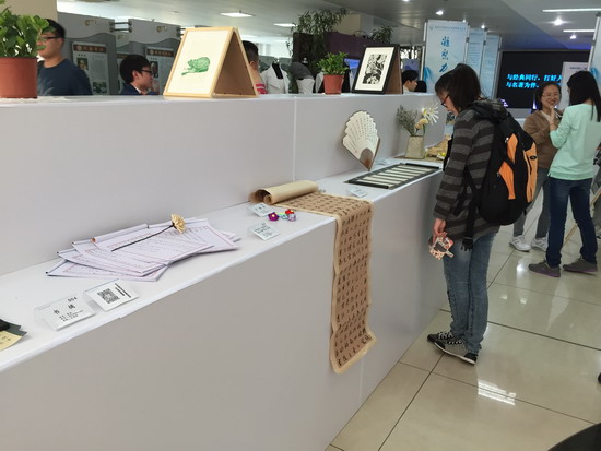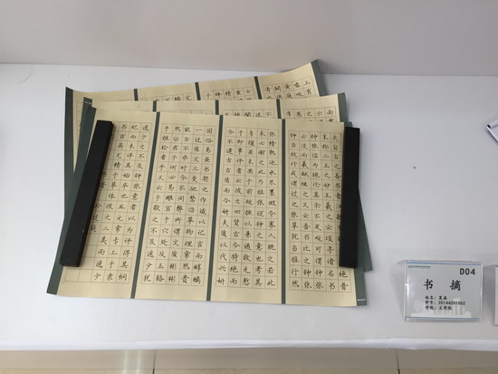接下来的展览厅参观之行给人留下深刻印象,展览厅中参观人员络绎不绝,展览厅分为创意生活、科学设想、凝聚力量和乐享科技等板块,各个学院可谓争奇斗艳,特色鲜明。其中文学院展示品书香气息浓厚,李肖锐、夏晶等人的书法吸引了不少参观者。