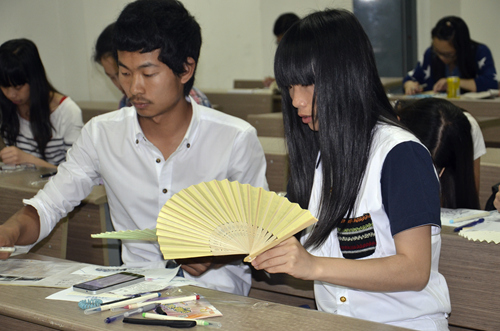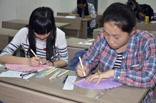 选手们有的单独创作,也有两三进行合作,他们在进行了认真的构思之后,开始了安静而又投入的创作。题字、绘图,一字一划都显得很慢很细致,一张张原本空白的扇面上出现了或端正娟秀的钢笔字,或洒脱飘逸的毛笔字,还有墨竹、兰花、鲤鱼等等这些富有传统艺术气息的图画。一个多小时之后,选手们陆续完成了作品,并将自己的扇面作品进行展示。选手和观众在细细欣赏了每一幅作品之后进行了投票。社团负责人核计了现场投票数,以现场投票分数占总分40%、微信投票分数占60%的评定标准,计算出了每一位选手的总分。比赛按总分高低评出了一等奖一名、二等奖两名、三等奖三名,并由社团负责人为获奖选手颁发了奖状和礼品。