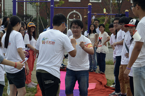 比赛的最后一轮是“吃洋葱圈”计时赛。所有队伍的队员都要赤脚走在凹凸不平的地毯上,并完成用筷子夹乒乓球和赤脚踩气球的任务,最终吃到悬挂起来的洋葱圈。七支队伍在这一轮的表现都十分精彩。其中,由文学院的吴超、李翱、冯英超、岳诗杰四位同学组成的小队更是以四十六秒的成绩赢得第一名。
