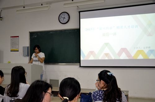 5月24日晚6:30,在文综楼2206教室,社联开展了2015“薪火相传”精英人才培训的最后一讲。此次为同学们进行培训的是苏州大学学生国际交流协会会长杨艺和竞智思辩社社长金梦蝶,她们以自己的工作经验为例,教同学们如何更好地进行未来的学生工作,如何克服将会遇到的烦恼和困难。