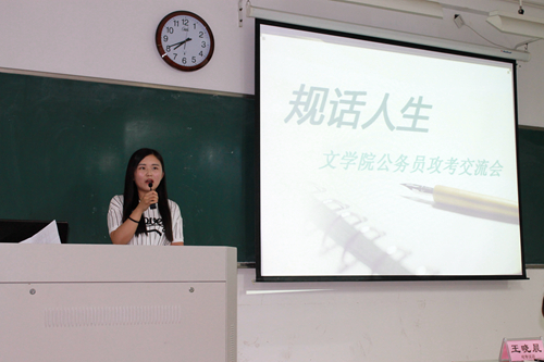 2015年6月10日18:30,在文综楼1002幢2201教室,扬帆学社开展了以“自我认识,规划未来”为主题的规话人生――文学院公务员攻考交流会。出席本次交流会的嘉宾是文学院2011级对外汉语专业的王晓晨、2011级文秘专业的王慧舟以及尚政公考的邹振老师。