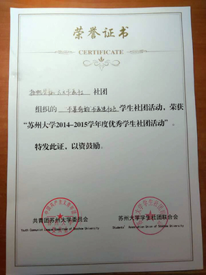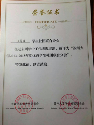 热烈祝贺我院社联在苏州大学学生优秀分院社联评比中被评为“2013-2015苏州大学优秀学生社团联合分会”;我院社团扬帆学社和云天书画社共同举办的“书墨荷韵”书画进社区活动荣获“苏州大学2014-2015学年度优秀学生社团活动”。