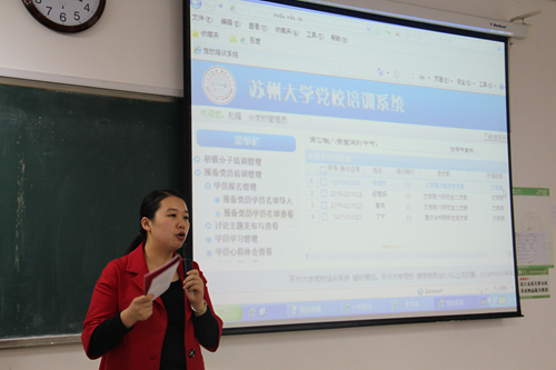 随之,赵曜老师对党校系统的运用方法进行了培训。她从登入党校培训系统的方法、党校培训中应注意的相关事宜以及预备党员和入党积极分子不同的培训方式、培训任务和结业考核方式进行了详细的说明,并嘱咐大家要按时地完成自己的培训任务,否则将无法顺利结业。
