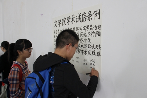 在组织学生代表在文学院学术诚信条例上签字后,纪金平老师对此次宣讲会进行了总结并宣布宣讲会结束。通过此次宣讲会,同学们知道了对于学生及学术研究者来说,应加强自律,提高诚信意识,积极促进良好的学术氛围,营造公平、诚信的主流价值观。