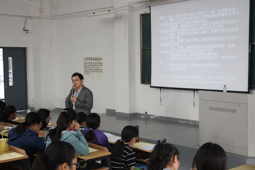 在宣讲会开始前,纪金平老师简述了诚信的重要性并向同学们介绍了张健书记,然后宣布宣讲会开始。接着张书记谈论了了解学术诚信规范的重要性,并以自身在国外交流的经历说明了中国学术诚信在国外经受的严峻挑战。之后,张书记鼓励同学们作为一名文学院的学生应该有责任有义务继承、发展、弘扬中国文化。