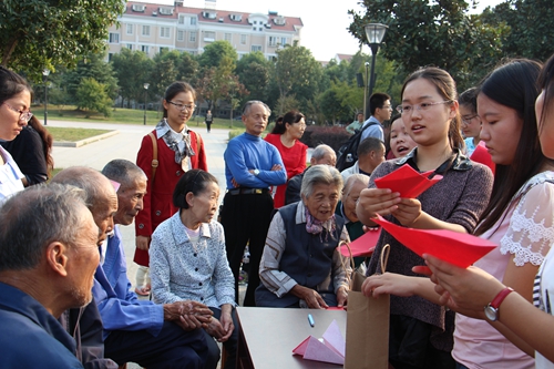 10月21日又是一年的重阳节。下午两点半,由苏州大学文学院团委主办、文学院扬帆学社和云天书画社联合承办的“重阳签签结”敬老活动在莲花五社区顺利展开。本次活动的主要目的是看望老人,陪老人度过一个温馨快乐的重阳节。此次活动的主要内容包括:品花茶、窗花剪纸、写对联、DIY书签、书法交流以及游戏互动等。