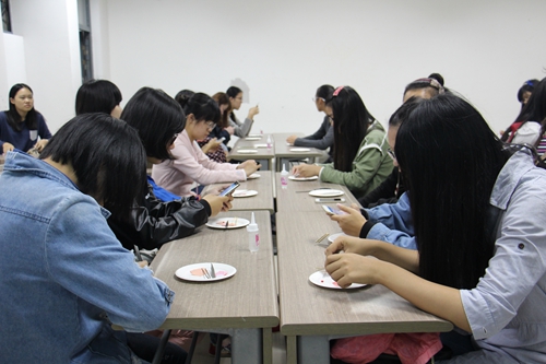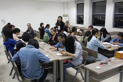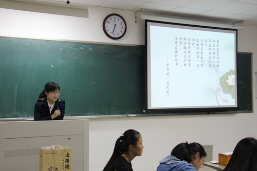 首先,主持人为同学们介绍了簪花的历史。簪花到如今已有两千多年的历史,是汉族妇女头饰的一种,根据其材质可将其分为鲜花、娟花、罗花,绫花、缎花、绸花、珠花等不同种类,而今天的活动主要学习制作的则是布艺簪花。此次活动纠正了许多人对簪花的误解,使同学们了解到簪花不是妇女专用品,实际上古时喜庆之日,朝廷百官巾帽上也要佩戴簪花。当然,簪花也并非离我们很遥远,至今苏南水乡妇女仍喜爱簪娟花。现在簪花已被列入国家级非物质文化遗产扩展项目名录。其后,主持人介绍了历朝历代不同风致的簪花,同学们被那些优美的簪花图片深深吸引着。接下来,主持人进一步深入地介绍了簪花文艺。簪花不仅仅是一种简单的饰品,它还有着深厚的文化底蕴。主持人绘声绘色地介绍了簪花小楷,簪花小楷为晋代卫夫人所创,曾被钟繇称颂:“碎玉壶之冰,烂瑶台之月,婉然若树,穆若清风。”唐代韦续则曰:“卫夫人书,如插花舞女,低昂芙蓉;又如美女登台,仙娥弄影;又若红莲映水,碧治浮霞。”可见簪花在艺术上的重要地位。主持人还带大家了解了绘画、诗词中的簪花。同学们都认真听着主持人的讲解,反应热烈。