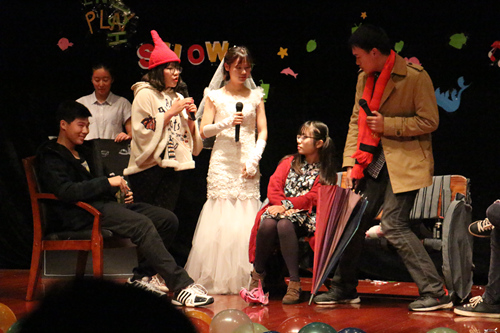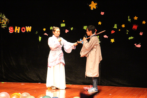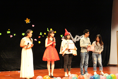 五彩的气球、缤纷的挂件营造出温馨浪漫的氛围,也点燃了所有人的激情。空气中到处都氤氲着青春的气息。随着主持人施缘园、吴佳雨的出场,本次大赛正式拉开帷幕。纪金平老师发表了致辞,感谢科协全体成员的辛勤努力并预祝本次大赛圆满成功。其后,比赛正式开始。首先是行政5班带来的短剧《甄�传》。惟妙惟肖的表演让观众仿佛来到了清朝,来到了皇宫。甄�、皇上、华妃等角色的扮演者用纯熟的英语、精湛的演技让观众见证了皇宫里的尔虞我诈,见证了甄�与雍正的绝美爱情。一句句经典台词也让现场的气氛迅速升温。随后,3班陈秋宇、张琪同学给大家带来的歌曲《一生有你》给观众带来美的享受,也使现场紧张的节奏得以舒缓。