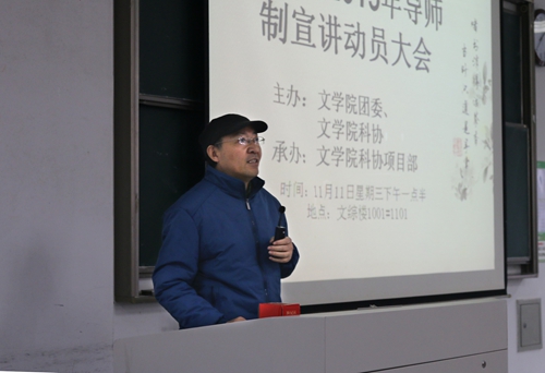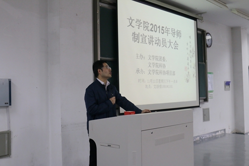 11月11日下午一点半,文学院2015年导师制宣讲动员大会在1001#1101教室举行。本次活动由文学院团委主办、文学院科协项目部承办。出席本次大会的有文学院副院长李勇、副教授艾立中以及学工办主任纪金平。