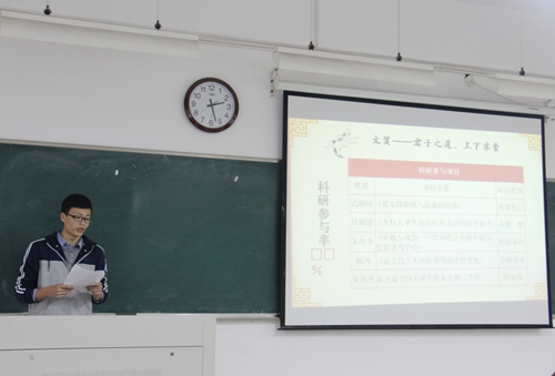 张书记讲话结束后,12级基地班班长孙健风为与会同学分享了12级基地班在学风创建活动中的有益经验。12级基地班致力于“鹿鸣、雕镂、文质”阶梯式的人文学风创建,创造性地提出第一课堂、第二课堂的创建。第一课堂以阅读为发端,转变传统课堂模式,提高同学学习兴趣,营造良好的学术氛围。第二课堂重在开展学术兴趣活动,引导同学养成良好的学习习惯,开拓视野,增长知识才干。在第一课堂中指出“阅读,是灵魂在辽阔心域的自我沉静”。由任课老师根据每个同学的不同推荐书目定期进行交流,收集读书心得。在第二课堂中开展班级研讨,让新鲜的思维在交流中碰撞,让每个人都有了展示的机会;同时针对班级特点开展“学海无涯,直击考研”的讲座,让每个同学准确定位,提升学习兴趣;第二课堂同时也是欢乐的,“唐寅画展,吴门遗韵”组织班级同学参观苏州博物馆;第二课堂更是贴近生活的,“陋室翰墨,书香宿舍”组织宿舍改造活动,让同学们的学习氛围更浓。在第一、第二课堂的开展中,还提出“他山之石,可以攻玉”发动同学们参与由陈国安老师发起的礼拜三沙龙,意在“平等自由”的求知氛围下,激发学生们积极向上的精神状态与精神风貌。开展读书会,带动每个人的学习乐趣。借助校级平台“重阳诗社”、“文殇”让每个同学找到兴趣点,以此构建较为完善的知识结构。12级基地班的学风创建得到很大成功,同学们普遍学习成绩优异,多名同学考取了985高校的研究生。孙健风同学的分享给了13、14级班长很大启示,同学们对此再次报以热烈的掌声。