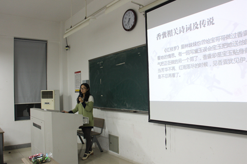 中传协会长蒋晨辰同学担任此次活动的主持人,在她的主持下,活动正式开始。她首先向同学们简单介绍了本次活动的流程,接着便直入主题,带领同学们进入了本次活动的第一个环节――香囊的讲解。蒋晨辰同学从何为香囊、香囊的种类、有关香囊的诗词和传说等方面给同学们做了一次简略的香囊科普。这一环节与下一环节的有奖竞答可以说是环环相扣的,因为第二个环节――有奖竞答的题目都是围绕这一环节所讲的香囊知识出的,在场的同学们都踊跃参加竞答,最后有四名同学获得了奖品。
