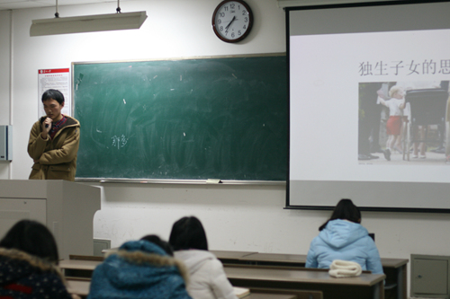 其后,15级的顾明珠同学与大家一同分享了对于二孩政策的思考。他举出了一个发人深省的实例:大孩不愿父母生二胎,甚至以自杀威胁父母。此例子引发了大家的思维热潮,顾明珠同学也从多个角度剖析了二孩政策带来的影响:与美国的对比、人口红利消失的解决办法、男女比例失调问题、人权问题等等。