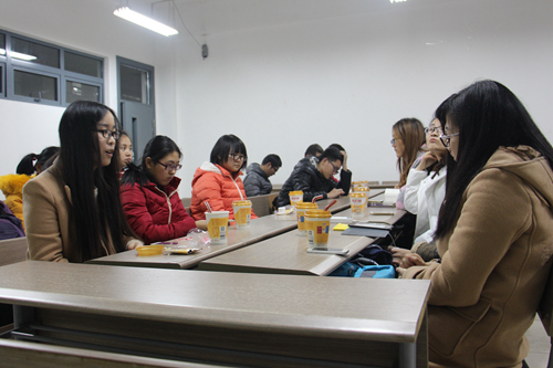 在交流会开始之前,每位到场的同学都得到了一杯配有热水冲泡的奶茶,再加上教室里的暖气,使得冬夜里的寒冷得到了缓解。这次交流会的内容主要是四位同学给大家介绍自己的兼职经验,她们分别是文学院12级的闻雯同学和冯心瑶同学、文学院13级的韩心仪同学以及政治与公共管理学院13级的胡真红同学。