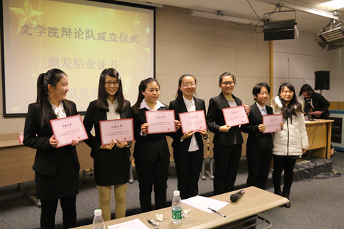 回顾历史,展望未来。之后,文学院辩论队成立仪式开始了,新一代文院辩手们收到了结业证书,并组成了文学院辩论队。王潇凡同学作为队长作了发言,表达了她取得进步的喜悦之情和对未来的期待。随后,竞智思辩社13、14级两届社长金梦蝶与徐慧同学也分别表达了对文学院辩论队的祝福。