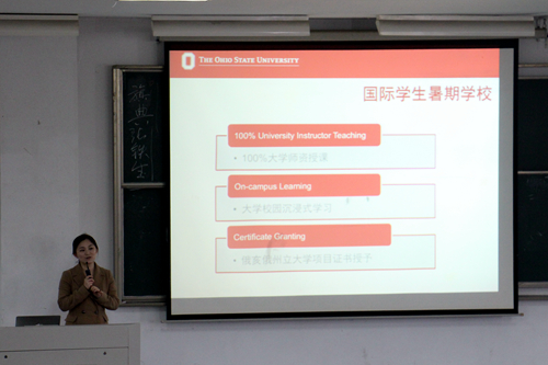 3月2日下午一点半,俄亥俄州立大学暑期出国交流学习项目宣讲会在文综楼1001#1101教室准时举行。出席此次活动的嘉宾有俄亥俄州立大学驻上海办事处主任由超老师,主任助理彭老师,文学院党委副书记、副院长张健老师,文学院学工办主任纪金平老师以及唐文治书院综合秘书胡月华老师。