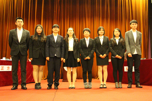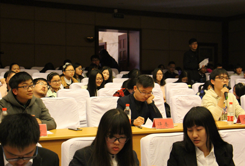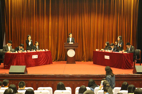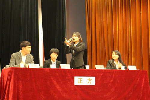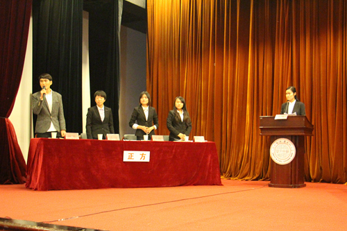 在主席介绍完毕之后,比赛正式开始。第一环节立论陈词,首先由正方一辩徐慧发言,在徐慧同学滔滔不绝的陈述中可以感受到她的坚定和稳重。然后由反方四辩提出质询,虽然他的气势咄咄逼人,但也未能吓到久经战场的徐慧。之后是反方一辩陈词,由正方四辩孔文龙质询,他切入点明晰,展现着一个辩手所拥有的理性和敏锐。第二环节辩驳,由正方二辩陆妮洁发言,她好似一名猛将,开场便气势不凡,在2分30秒的时间内从容不迫地论证辩驳,面对反方三辩的诘问也丝毫没有困窘。正方三辩陈嘉琳质询反方二辩的问题更是犀利尖屑,她虽然是唯一一位大一辩手,但其表现同样很出色,赢得了在场观众的阵阵掌声。第三环节自由辩论,也是本场比赛最精彩的部分,双方辩手互不相让,气氛十分热烈。最后一个环节总结陈词,由双方四辩发言,我院孔文龙同学在他温文尔雅的气质中再一次呈现出精彩的表现。