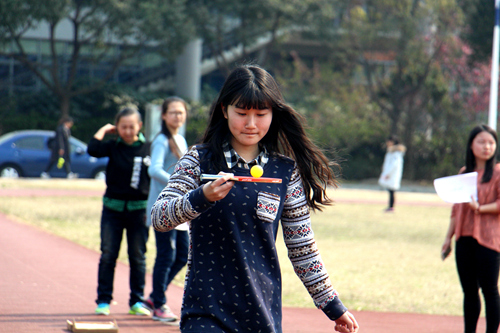 第三个项目“运球接力”的规则十分简单:参赛选手将乒乓球放在乒乓球拍上,不能用手固定,每个人每次只能托一个球,将球送到距起点二十米的纸盒内,球不掉在地上为有效,如果球在托送途中掉到地上,选手必须回到起点重来。在比赛的两分钟里,纸盒内球量最多的一组获胜。在经过简单的练习后,比赛开始,大家用快走、慢跑等方法运球,虽受天气影响仍热情不减,最后“吃货队”以八颗球的好成绩再次获得第一名。