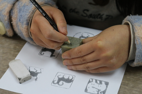 活动开始前,同学们都拿到了以动物为图案的图纸作为篆刻图案的参考。由于现场有很多同学是第一次参加篆刻活动,所以,作为主讲人的袁也同学向这些首次接触篆刻的同学们讲解了篆刻的基本要领并示范动作,掌握了这些基本方法就算是篆刻入门了。他还向大家展示了不少篆刻初学者的优秀作品,其中也有他自己篆刻的印章,并说篆刻“入门容易,深入难”,大家作为初学者,只是因兴趣而篆刻,想要刻出这些图案并不是难事,从而增加了同学们对篆刻这一活动的信心。