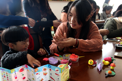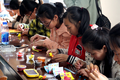 在活动现场,那些平日里欢蹦乱跳的小精灵们,此刻正用心呵护自己的佳作。他们认真的神情里,透着一股小心翼翼的执着;明亮的双眸里,有着一种对梦想的细致入微的关切。他们的表现感染着活动现场的每一位同学。同时,他们的专注也正成为一支力量,将操劳于日常琐事的大人们带回到了最简单的快乐里面。随着时间的推移,桌子上已完成的作品也越来越多:憨态可掬的棕色小熊、头戴鲜花的羞涩小猪、长着翅膀的彩色蘑菇……还有一个小朋友更是久久地陶醉于自己的“玫瑰花”所散发的迷人“芳香”中。
