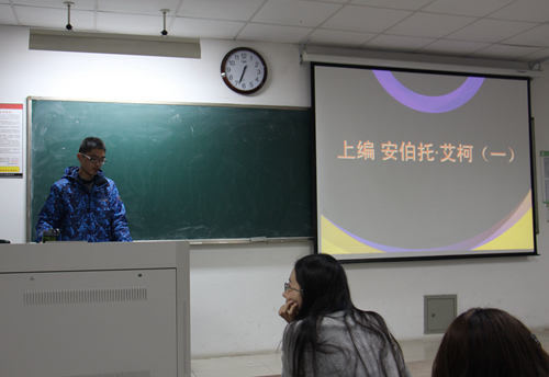 活动开始后,主持人致词并介绍了今天的主讲人徐栋。其后,徐栋同学向大家介绍了艾柯及其《玫瑰之名》《昨日之岛》《波多里诺》等主要作品,继而通过他的另外三部作品讲述其是如何走上小说创作之路的:《二加二是等于四吗?》讲述艾柯在一个四分钱的冰淇淋派和两个两分钱甜筒之间的选择上升到思考的角度来看待身边的小事;《你所不知道的开头或结尾》以“现实人生中,我们往往迟迟进场,又匆匆离席。”一句向读者阐述在现实生活中我们做某些事情往往结果未知,就已离开;《财产清单编制窍门》以嘲讽的态度来“对抗”生活中某些不合理的做法。故此,徐栋同学得出结论:安伯托・艾柯由于思考我们未思考的事情,所以他才从有故事的人变成一个讲故事的人。