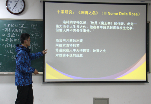 接下来,徐栋同学以《玫瑰之名》与《昨日之岛》为例使同学们了解了艾柯对生活的细致观察、对现象的深邃思考以及他对人生的嘲讽态度,并让大家学习其作品的随笔式框架、作品中的知性背景以及知识分子的丑剧对突出主旨的作用。然后,他又向大家分享了他对于《玫瑰之名》的研究,让同学们了解了中世纪的黑暗状态及艾柯是如何将符号学理论转化为符号学小说的。紧接着,他又阐述了《玫瑰之名》名称的由来,即罗马谚语“昔日的玫瑰只余芳名”。