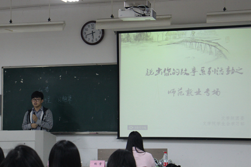 4月6日下午17:00,由文学院团委、文学院学工办主办,文学院学生会学习部承办的“说出你的故事”系列活动之师范就业专场在文综楼1003#3206教室正式开始。本场活动的主讲嘉宾为文学院2012级的王颖、盛超楠以及王斌三位同学。