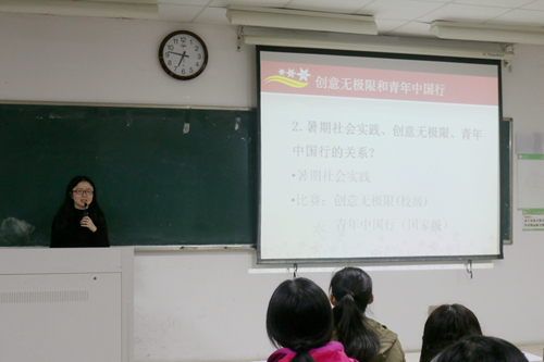 随后,文学院团校秘书长朱琰又介绍了校级的社会实践比赛“创意无极限”及其赛事日程安排,并强调要尽早完成实践活动,这样有利于奖金的申请以及社会实践先进个人的评比。强调完重点后,她又向同学们展示了2014及2015年度青年中国行全国二十强课题,其内容包括文化遗产、生态环境、医患关系等众多社会共同关注的话题,涉及了社会生活的各个方面,不少题材内容新颖有亮点,令人耳目一新。实践团队类型包括网络技术普及实践服务团队等,团队的类型能够自动归类。介绍完这些,她又向同学们展示了2014及2015年文学院及唐文治书院暑期社会实践活动重点团队,他们的点子同样富有创意。最后,她又强调了具体实践的开展时间以及每日材料撰写的要点,并鼓舞大家尽早参与到社会实践活动中去。