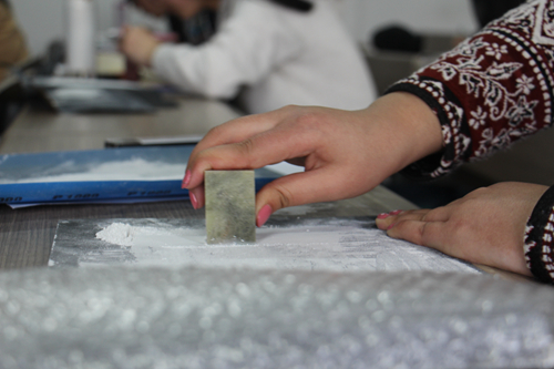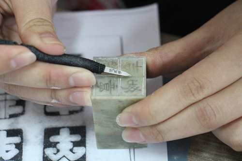 讲解结束之后,同学们便开始动手做起自己的印章。刻章石在砂纸上摩擦的声音、刻刀在刻章石上篆刻的声音于教室里不断地回响着。同学们低着头专心地刻着章,袁也同学则为同学们讲解刻章中遇到的具体问题。而同学们篆刻的图案亦是不尽相同、丰富多样。有的同学在篆刻着“吉祥如意”“长寿”这些有吉祥寓意的字,也有的同学刻的是其他同学的名字,准备以此作为一份特别的礼物送给对方。
