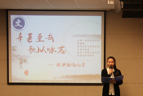 4月13日晚18:30,由文学院团委、文学院学工办主办,文学院科协办公室承办的“幸甚至哉,歌以咏志”――文学院经典朗诵比赛在文综楼1005#5339准时举办。此次活动邀请到文学院科协理事长张雪彦、凤凰传媒学院14级播音与主持艺术专业学生吴科宏前来担任评委。