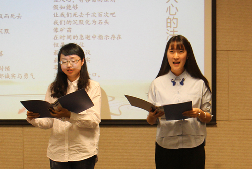 很快,最后一个环节“千金一诺赤子心”在大家的期待中到来了,六位晋级选手两两一组朗诵诗歌。第一组李唯伊、范睿仪在《人心的法则》朗诵中巧妙配合,十分精彩,但评委们指出存在不够自信、两个人表演不平衡的瑕疵。第二组选手田雪晴、赵晨璐带来的是舒婷的《诗与诗人》,她们配合默契,抑扬顿挫,但评委吴科宏建议赵晨璐应加强气息训练。第三组选手曹志伟、吕云的一首《春天,遂想起》情感深沉,他们的演绎像对话一般自然。