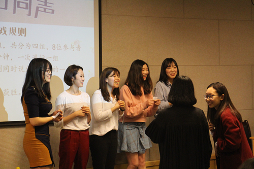 贴心的韩国朋友还准备了一个小型才艺表演,他们为大家合唱了一首优美的中国歌曲《月亮代表我的心》,在场的同学们也自发地挥舞起了手臂与他们一起唱,气氛十分温馨。看过了精彩的表演,活动进入第二环节“全球大猜想”,在场同学向韩国留学生们提出了关于韩国的各种问题,韩国朋友们也耐心地一一回答。紧接着就是第三环节“异口同声”小游戏,大家都踊跃参与,场景一时热闹非凡。