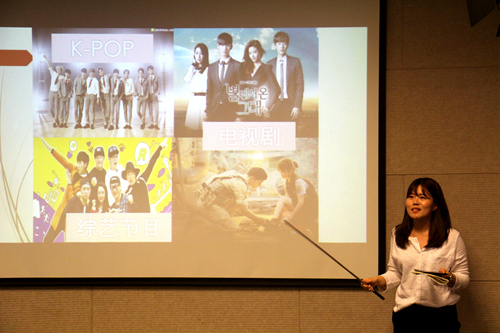 最先上场的是韩国朋友们,他们的介绍共分为三部分。第一部分是韩国的一些基本情况,在韩国同学流利的汉语中,同学们了解到了韩国的位置、韩国国旗的意义以及韩国钱币的分类。接下来是韩国传统文化的介绍,在这一部分中,大家不仅感受到了异国节日的别样风情,还领略到了韩服的魅力,看到了韩国诸多著名景点的美丽风光。第三部分,韩国同学向大家分享了韩国大学生的生活体验,还介绍了时下正当红的韩流明星。