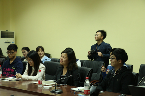 其后,两院的老师同学们就有关科研活动方面的内容展开了交流讨论。政治与公共管理学院科协理事长吴月同学作为此次交流会的助阵嘉宾,以管院为例向上大文学院的老师同学们介绍了我校的科研情况。她先从管院科研活动的概况入手,介绍了面向导师与面向学生两个不同方面的内容。随之,她提及对于课题新手与课题精英,管院所采取的不同的培养方式,即“兴趣培养”与“满足需求”。其后,她通过对管院一年的科研活动时间轴的展示,说明了“保持科研项目,步步孵化”的科研理念。最后,她又强调了“理论与实践相结合”在科研活动中的重要性和必要性。在吴月同学介绍完毕之后,上海大学文学院的老师和同学就有关“挑战杯”、导师制、“学士杯”等方面提出了一些问题,并得到了胡萱老师和吴月同学的详细解答。