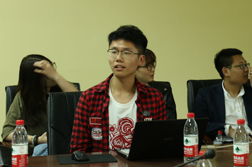 紧接着,上海大学文学院团委学生会主席胡思齐同学以幽默风趣的口吻向大家介绍了上海大学文学院团委学生会的基本情况。上海大学文学院团委学生会秉持着“引领凝聚赢青年,传统文化育英才”的宗旨。在架构与理念方面,胡思齐同学介绍了其部门构成以及“骨干队伍优化培养、服务广大老师同学”的工作理念,并向大家介绍了校友讲坛、迎新晚会等一系列活动。在特色与创新方面,上大文院团委学生会结合专业特色、弘扬传统文化,长期举办如“文学之夜”这样的特色活动,十四个社团亦是各具特色,为上大增添了一道亮丽的色彩。在介绍完上大文院团委学生会的新媒体阵地建设情况之后,胡思齐同学以一首打油诗作结,其中“服务广大师生后,便可深藏功与名”一句更是深深引起了在场同学们的共鸣。