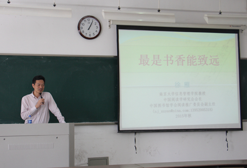 2016年5月6日下午13:00,由苏州大学文学院、苏州大学团委、苏州大学图书馆、苏州大学中国传统文化工作坊联合主办的读书节系列讲座之“最是书香能致远――读物选择与幸福追求”专题讲座在文综楼1003#3202教室正式开讲。此次讲座的主讲人是南京大学信息管理学院教授、江苏省政协常委、中国阅读学研究会会长、中国图书馆学会阅读推广委员会副主任徐雁。文学院党委副书记、副院长张健亦出席了此次讲座。